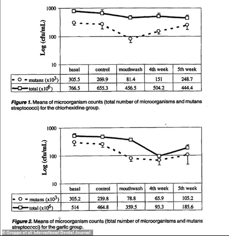 Një ekip nga Universiteti i Sharjah në Emiratet e Bashkuara Arabe analizoi rezultatet e pesë studimeve të ndryshme dhe zbuloi se ekstrakti i hudhrës mund të ofrojë mbrojtje më të gjatë kundër baktereve, krahasuar me gargarat standarde që përmbajnë klorheksidinë (p.sh. Corsodyl, Covonia, Savlon).