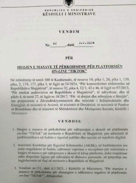 Agjencia për Media dhe Informim sqaron median dhe opinion publik në lidhje me vendimin e Këshillit të Ministrave datë 03.02.2026 për heqjen e masave të përkohshme për ndalimin e aksesit në platformën online TikTok