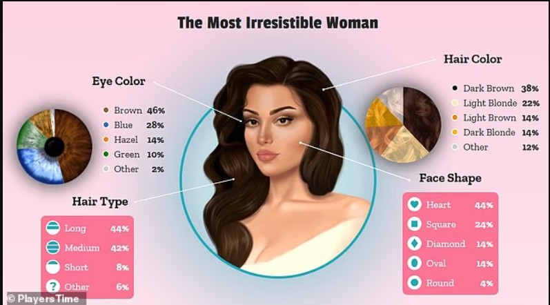 Rezultatet zbuluan profilin tipik të gruas më tërheqëse sot: sy të errët, flokë të gjatë kafenj, dhe lartësi mesatare deri në të lartë, rreth 1.72 m (5 ft 6).