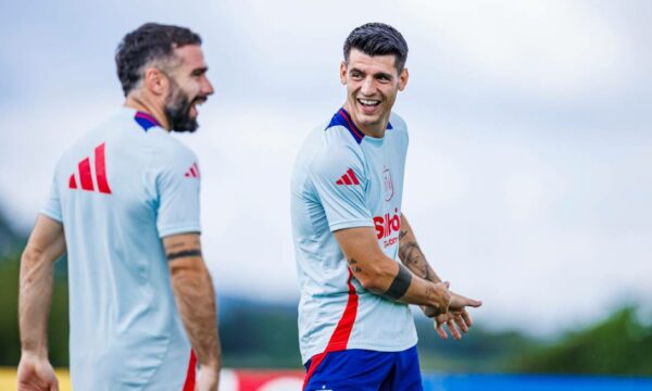 Alvaro Morata zbriti në fushë me shokët për stërvitjen e Spanjës mëngjesin e së enjtes në Donaueschingen. Në vend grumbullimin e kombëtares La Roja.