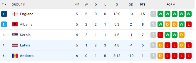 Tani, Letonia është e katërta me pesë pikë, tri më pak se Shqipëria në vendin e dytë, që ka një ndeshje më pak të luajtur.