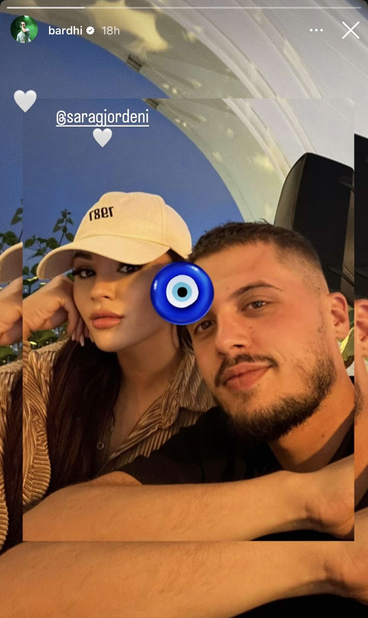 Në imazh, çifti shfaqet i buzëqeshur dhe i lumtur, ndërsa në përshkrim Bardhi ka vendosur një simbol të syrit blu, i njohur si një mburojë kundër syrit të keq.