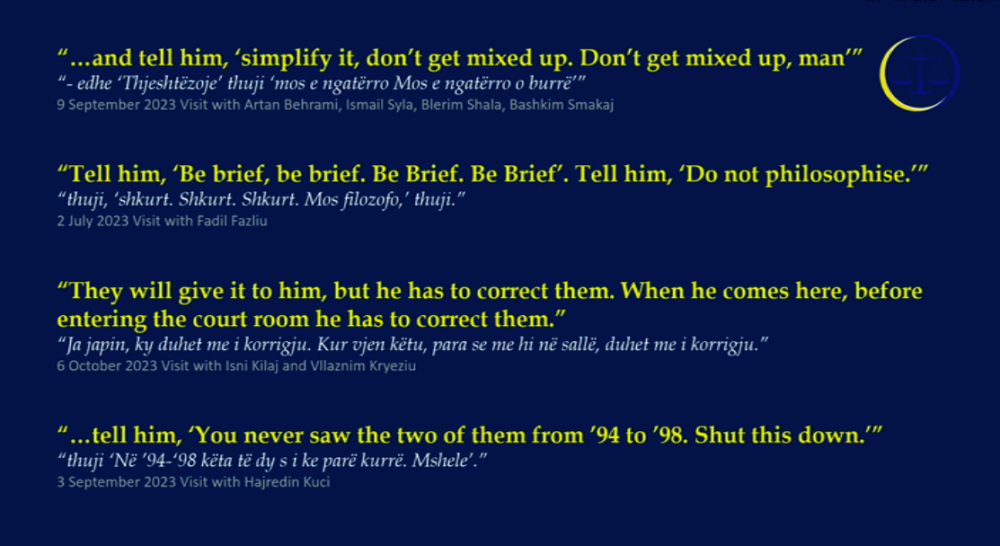 Prokurori ka nxjerrë në ekran disa prej deklaratave që Hashim Thaçi ka bërë gjatë takimeve dhe bisedave që ka pasur me të akuzuarit për këtë rast dhe me persona të tjerë, e të cilat janë përgjuar.