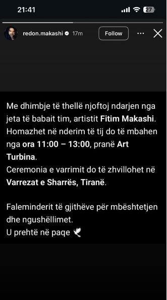 “Me dhimbje të thellë njoftoj ndarjen nga jeta të babait tim, artistit Fitim Makashi. Homazhet në nderim të tij do të mbahen nga ora 11:00-13:00, pranë Art Turbina.