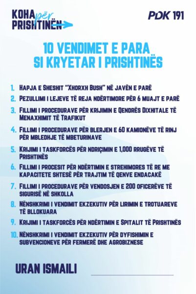 Ismaili prezantoi edhe 10 vendimet e para që do të ndërmarrë si kryetar i Prishtinës: