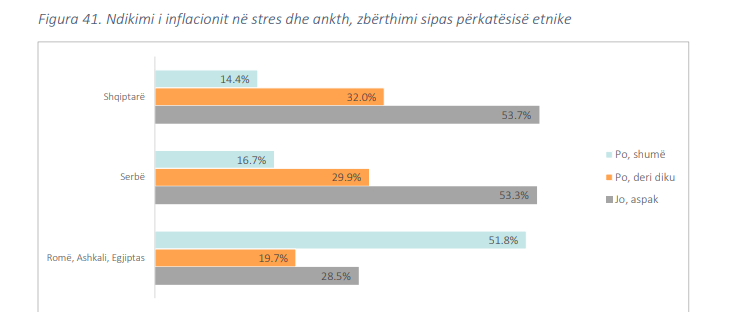 Referuar etnisë, inflacioni ka ndikuar në shëndetin mendor më së shumti te pjesëtarët e komuniteteve rom, ashkali dhe egjiptian, 51.8% prej tyre kishin shprehur nivele të larta të stresit dhe inflacionit.
