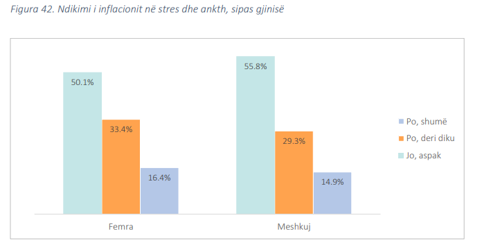Për sa i përket gjinisë niveli ëshë më i përafërt, 50.1 e grave janë shprehur si shumë të stresuar për shkak të inflacionit, ndërsa te meshkujt kjo shifër shkon në 55.8%.