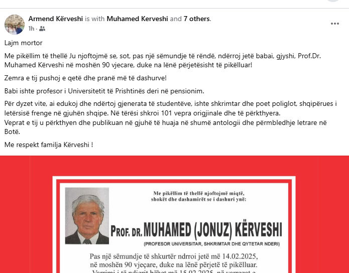“Me pikëllim të thellë Ju njoftojmë se, sot, pas një sëmundje të rëndë, ndërroj jetë babai, gjyshi, Prof.Dr. Muhamed Kërveshi në moshën 90 vjecare, duke na lënë përjetësisht të pikëlluar! Zemra e tij pushoj e qetë dhe pranë më të dashurve! Babi ishte profesor i Universitetit të Prishtinës deri në pensionim”, thuhet në njoftimin e familjarëve.