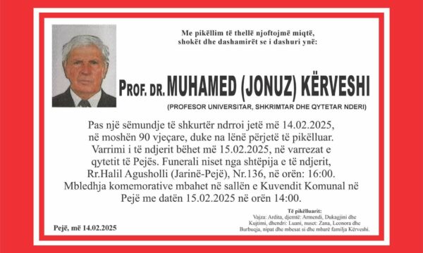 “Me pikëllim të thellë Ju njoftojmë se, sot, pas një sëmundje të rëndë, ndërroj jetë babai, gjyshi, Prof.Dr. Muhamed Kërveshi në moshën 90 vjecare, duke na lënë përjetësisht të pikëlluar! Zemra e tij pushoj e qetë dhe pranë më të dashurve! Babi ishte profesor i Universitetit të Prishtinës deri në pensionim”, thuhet në njoftimin e familjarëve.