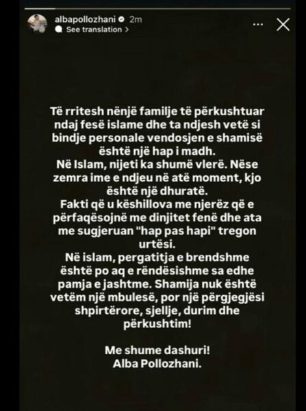 “Fakti që u këshillova me njerëz që e përfaqësojnë me dinjitet fenë dhe ata më sugjeruan ‘hap pas hapi’ tregon urtësi. Shamija nuk është vetëm një mbulesë, por një përgjegjësi shpirtërore”, shkruan Alba.
