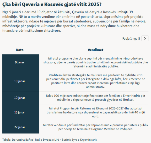 Gjatë vitit 2025, Qeveria në detyrë, e udhëhequr nga kryeministri Albin Kurti, mbajti gjithsej 39 mbledhje.