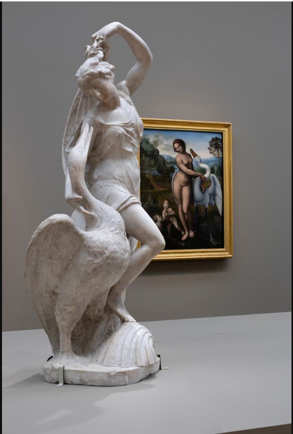 Në ekspozitë përfshihen modele allçie nga Auguste Rodin, me figura që dalin nga shkëmbi i papërpunuar, si skulptura femërore e krijuar nga Pigmalioni në legjendën e Ovidit, e cila merr jetë. Ka edhe një sallë të frymëzuar nga miti i Ledës dhe Mjellmës, ku Zeusi “josh” mbretëreshën spartane duke marrë formën e zogut.