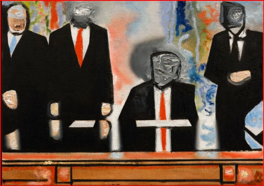 Shumica e këtyre veprave janë pa titull dhe “të thyer” në kuptimin që lidhja me burimin e tyre është e vështirë, si një link i prishur online. Ato gjithashtu nuk bashkohen si një e tërë. Çfarë i lidh ngjyrat acid dhe tonet e errëta të brendësisë së përbuzshme të Shtëpisë së Bardhë me një pyll të frikshëm? Çfarë lidh presidentin Trump me themeluesit e muzikës industriale? Disa lidhje shfaqen gradualisht, sepse truri ynë është i prirur të gjejë modele edhe në kaos.