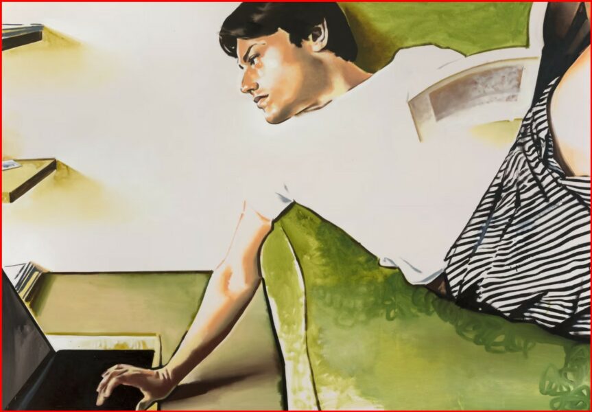 Në katin e sipërm, portreti i djalit të tij, Kacper, ulur në një divan me një libër në gjunjë, arrin te laptopi si Zoti te Adami. Vëmendja e shpërndarë, tipike e epokës moderne, zëvendëson përqendrimin e portreteve të shekullit XIX. Historia luhet para ekranit tonë, dhe nuk mund të largohemi.