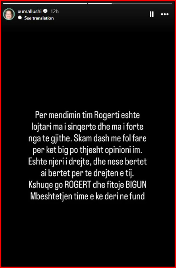 Përmes një postimi në rrjetet sociale, Xumi ka shprehur mendimin e tij, duke e cilësuar Rogertin si një nga lojtarët më të fortë dhe më të sinqertë brenda shtëpisë.