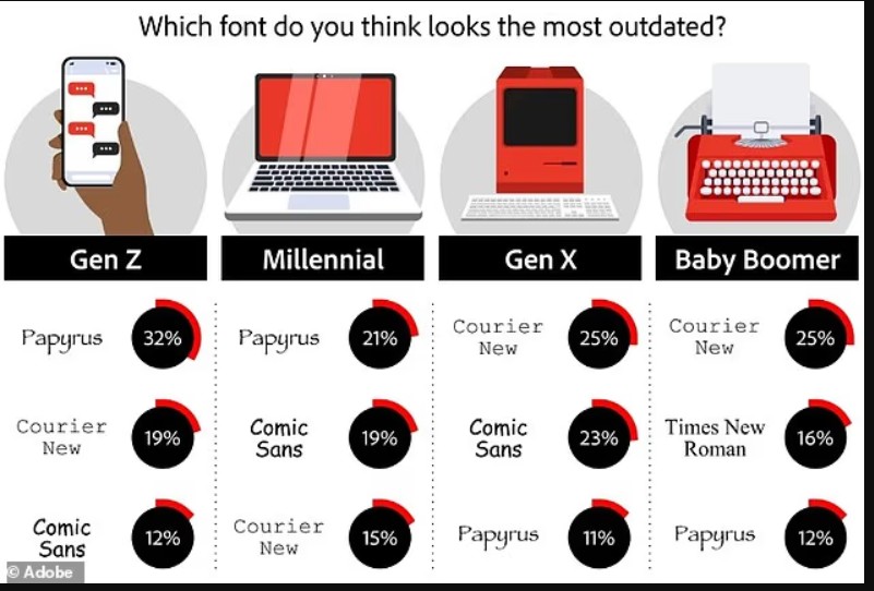 Ekspertët e Adobe pyetën mbi 1,000 persona rreth mendimeve të tyre mbi 13 nga fontet më të njohura, përfshirë Times New Roman, Arial, Comic Sans dhe Verdana.
