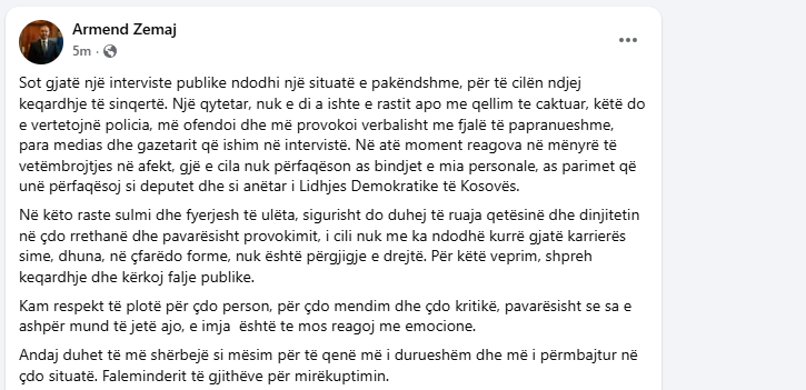 “ Sot gjatë një interviste publike ndodhi një situatë e pakëndshme, për të cilën ndjej keqardhje të sinqertë. Një qytetar, nuk e di a ishte e rastit apo me qellim te caktuar, këtë do e vertetojnë policia, më ofendoi dhe më provokoi verbalisht me fjalë të papranueshme, para medias dhe gazetarit që ishim në intervistë”, ka thënë Zemaj.