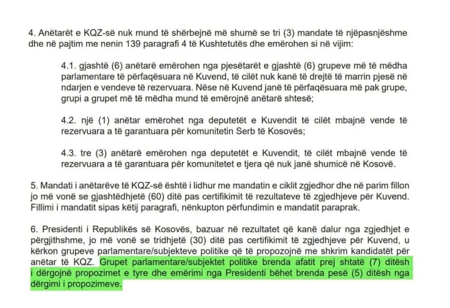 Sipas paragrafit 6 të nenit 61 të Ligjit për Zgjedhjet e Përgjithshme ku flitet për mandatin dhe emërimin e anëtarëve të KQZ-së, subjektet politike duhet që brenda afatit prej 7 ditësh t’i dërgojnë propozimet e tyre. Pra, ky afat do të skadojë më 15 mars 2026.
