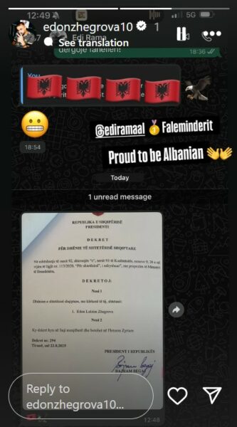 Në Instastory, futbollisti i Lillet shkroi: “Krenar me qenë shqiptar”, duke ia përcjellë emojit me flamurin kombëtar shqiptar dhe me një shqiponjë.