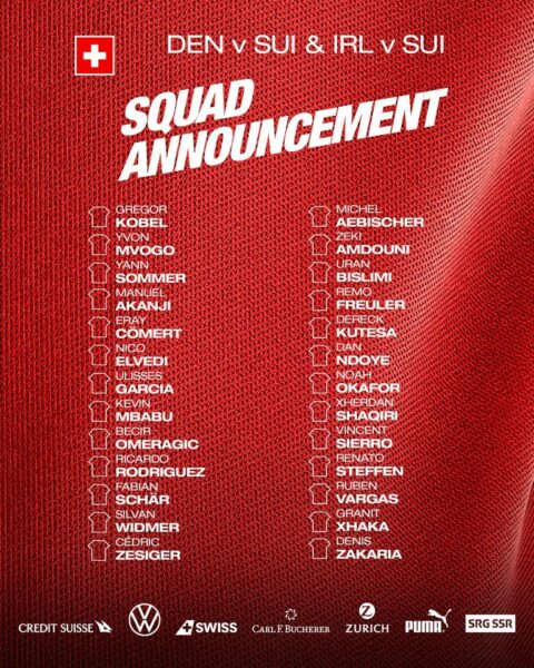 Selektori i Kombëtares së Zvicrës, Murat Yakin e ka publikuar sot listën e futbollistëve të ftuar për miqësoret e marsit.